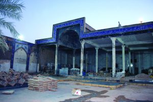3ـ صخرة بيضاء من حجر النورة ـ الظاهر أنها كانت مبنية على باب حرم مسلم بن عقيل وقد ذكر فيها أسم مجدد بناء الحرم، إضافة لنص شعري ينتهي بتاريخ (هي باب حطة فادخلوها سجدا) سنة 1232 والمجدد هو نواب حافظ محمد عبد الحسين خان) ثم يضيف (الظاهر من هدف الألقاب أن المجدد كان رجلاً من عظماء الهنود وأمرائهم)(29).