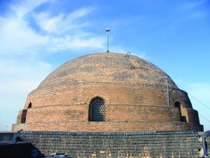 كما أن القبة تعد من أكبر القباب الموجودة في (قُم)، حيث يبلغ قطرها (10م) تقريباً في حين يبلغ ارتفاعها (3م) تقريباً والقبة مرصوفة من الداخل بالطابوق بطريقة هندسية جميلة ومتقنة حتى شكل هذا الرصف لوحة مزخرفة تنبئ عن مهارة المعمار ومن الخارج تبدو القبة بيضاء لأنها مكسوة بمادة الجص، تبلغ مساحة الحرم الكلية حوالي (75م2) تقريباً وقد قسمت إلى قسمين قسم خاص بالرجال وآخر بالنساء. أما الجدران فترتفع (8م) أو أكثر.