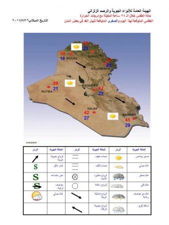 المنطقة الوسطى: العظمى ترتفع قليلا عن يوم امس وتتراوح بين (40-42) م°والصغرى تتراوح بين (21-23) م°.