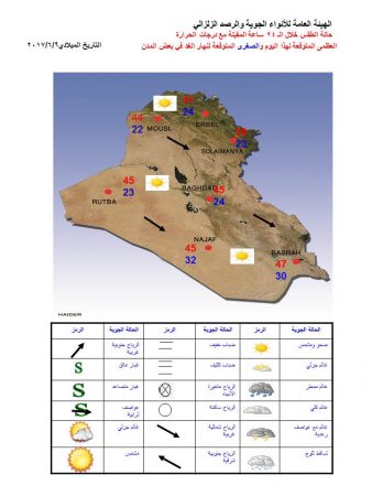 المنطقة الوسطى: العظمى ترتفع قليلا عن يوم امس وتتراوح بين (43 -47) م°والصغرى تتراوح بين (24-28) م°.