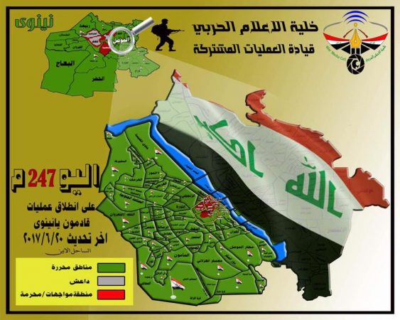 وتبين خريطة نشرتها الخلية، ان ‘المناطق المحررة ومناطق تواجد عناصر تنظيم داعش الإرهابي تمثل مساحات صغيرة جداً’، لافتةً إلى أن ‘(247) يوماً قد مر على انطلاق عمليات قادمون يانينوى’.