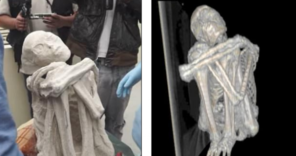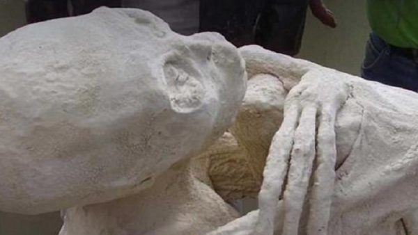 ويقول خبراء نظرية المؤامرة إنهم وجدوا “إنسانا محنطا” غامضا بـ 3 أصابع، وجمجمة غريبة الشكل. ولكن النتيجة لم تُقنع الجميع، حيث قال أحدهم، إن النموذج المقدم مجرد تمثال من الجص.