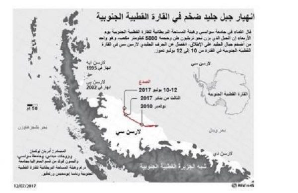 وقال العلماء في جامعة سوانسي وهيئة المساحة البريطانية للقارة القطبية الجنوبية إن الجبل الذي يزن نحو تريليون طن وحجمه 5800 كيلومتر مكعب انفصل عن الجرف الجليدي لارسن سي في القارة القطبية الجنوبية في الفترة من 10 إلى 12 يوليو تموز.