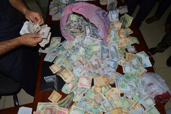 واكدت ” خلال تفتيش منزل المتسولة عثر على مبالغ مالية كبيرة ومخشلات ذهبية وان المبالغ الكبيرة كانت ملفوفة في اكياس من النايلون وعند عدها وفرزها وجدوا ٧٢ مليون و٣٢٢ الف دينار عراقي و٥٦٢ دولار امريكي و تسعين ريال سعودي و١١٩ ليرة لبنانية و١٠ يورو و٣٠٠ دينار كويتي و٤٤٠ تومان ايراني وسبعين روبية افغاني و٣٢٠ روبية باكستانية مع عملات نقدية هندية وأخرى غير معروفة فضلا عن العثور على مخشلات ذهبية.
