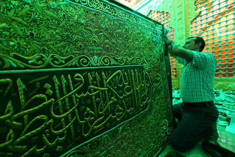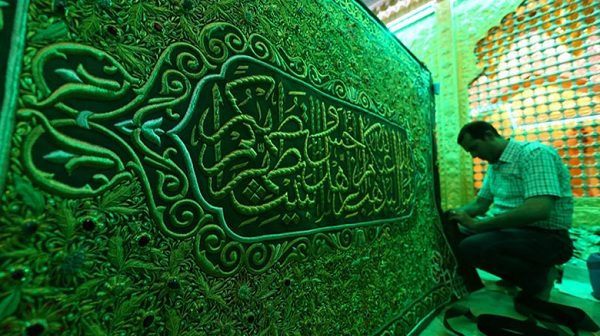 مصور.. كسوة مطعمة بالذهب والأحجار النادرة تكسو أضرحة أهل البيت بعد سنوات من الاعتداء الإرهابي على قبورهم!!