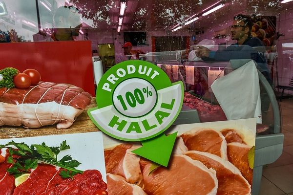 A photo taken on August 2, 2016 shows the entrance of a halal butchery in Lille, northern France. The question of the financing of the Muslim Faith, now considered to be insufficiently transparent, continues to shake the political class, after a new opinion pirce by French Prime Minister Manuel Valls in the French newspaper Liberation, where the Prime Minister does not rule out "a form of public funding." "A Funding by the faithuls throw a traditional manner or a newer one like the halal or the crowdfunding is quite possible and it is more consistent with the vision of our country" he pleaded. / AFP PHOTO / PHILIPPE HUGUEN