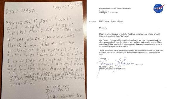 وكتب الطفل في رسالته يقول إنه مؤهل لهذه الوظيفة لأن شقيقته ترى أنه من الفضائيين، وأنه سبق له أن شاهد أمثال هؤلاء الناس في الأفلام.