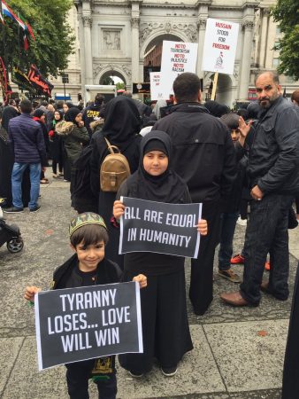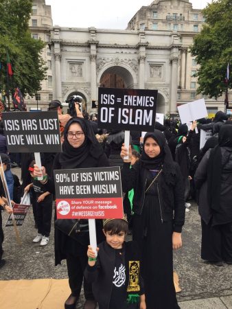 واتشح المتظاهرون رجالا ونساءا وأطفالا بالسواد، ورفعوا لافتات كتب عليها: “تنظيم الدولة الإسلامية خسر، والحب سينتصر” و “90 في المئة من ضحايا تنظيم الدولة من المسلمين” و “تنظيم الدولة= أعداء الإسلام” و”لا للإرهاب ولا للعنصرية ولا للظلم”.