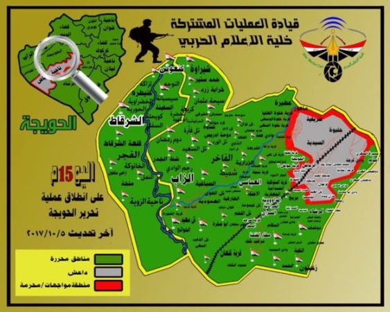 وقال قائد عمليات تحرير الحويجة، الفريق الركن عبد الأمير رشيد يار الله، في بيان له إن” قوات جهاز مكافحة الإرهاب والحشد الشعبي وعمليات شرق دجلة حررت خمس قرى”.