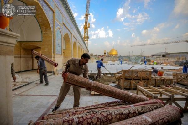وأوضح” تم نقل العدد الكافي من السجاد الى المواقع المقررة كما تمت المباشرة بفرش القاعة الرئيسة في الطابق العلوي لجزء الزيارة والعبادة، وقد وصل عدد السجاد الى أكثر من 4 آلاف سجادة، وآلاف القطع من الكاربت بأعداد وقياسات مختلفة “.