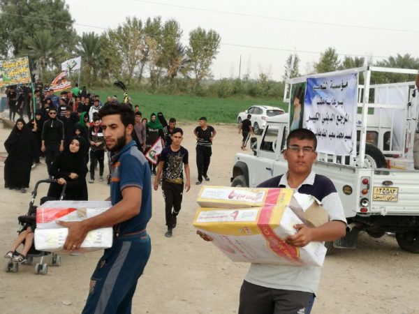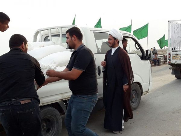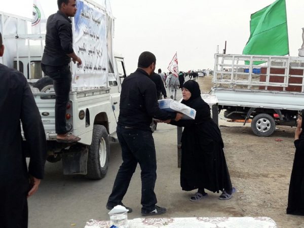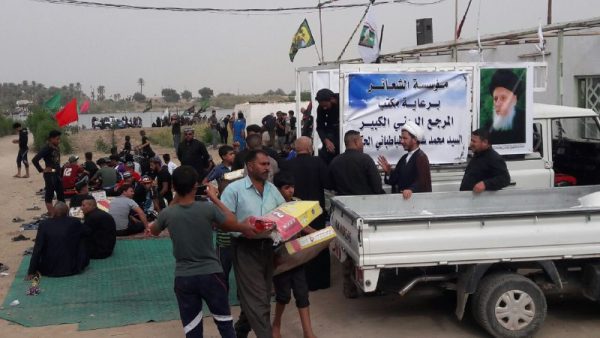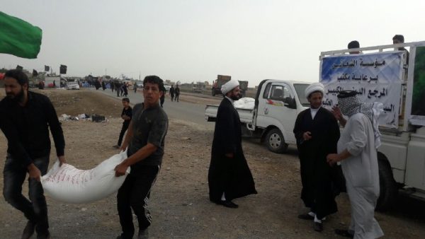 مؤسسة الشعائر برعاية المرجع السيد الحكيم تواصل توزيع المواد الغذائية على المواكب الحسينية في الطريق المؤدي من واسط إلى الشوملي