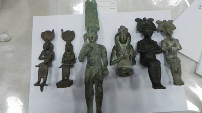 ومن بين القطع الأثرية المستردة إناء فخاري يحمل اسم الملك رمسيس الثالث، الذي حكم مصر قبل 3000 عام، إلى جانب عدد من التماثيل البرونزية التي تمثل الآلهة المصرية من بينها تماثيل للآلهة إيزيس والإله أوزيريس.
