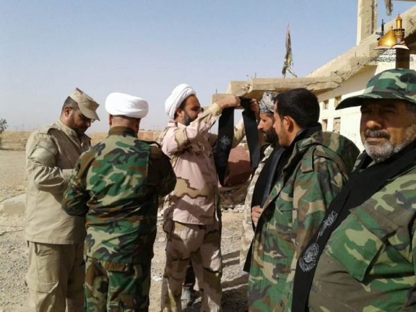 مبلغو الحوزة العلمية في النجف الأشرف يتفقدون مقاتلي الحشد الشعبي من لواء أنصار المرجعية ولواء الطف المرابطين في صحراء الجزيرة وجبال مكحول في محافظة صلاح الدين ويقلدون الأبطال وشاح أمير المؤمنين (عليه السلام)