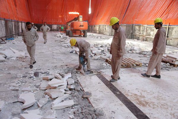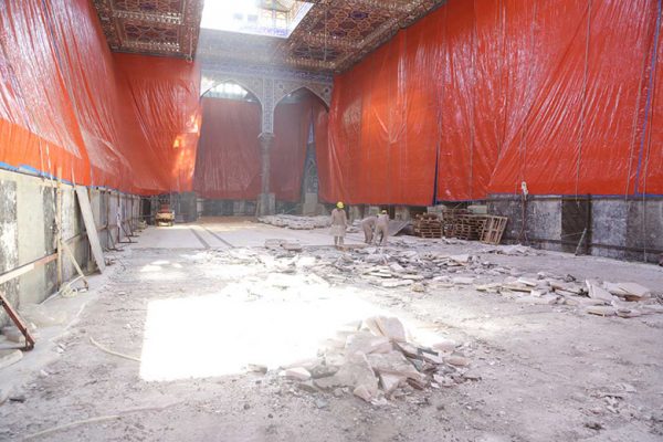 وأضاف، “الاعمال المنجزة شملت رفع مرمر أرضية الصحن وتقطيع الكونكريت الذي تحته، إلى جانب رفع الثريات ضمن منطقة العمل”. موضحا، “تمت التهيئة الكاملة للشروع في أعمال المرحلة الثانية التي تتضمن عمل القالب ووضع الجدار الكونكريتي الساند للأبنية القديمة بعمق 15 مترا تحت الأرض، ومن ثم حفر السرداب بعمق 7 أمتار”.