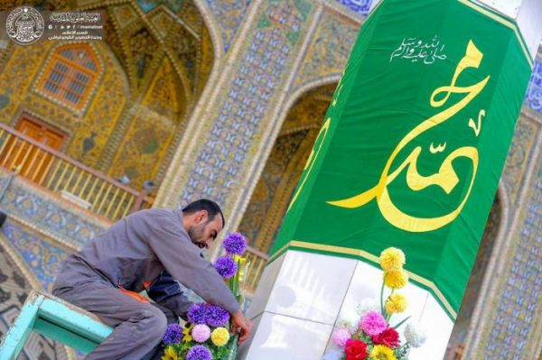 أرجاء مرقد أمير المؤمنين (ع) تتشح بالورود واللافتات الملونة استعدادا للاحتفال بالمولد النبوي الشريف