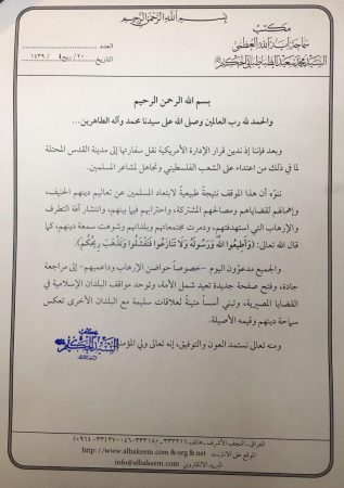 الحكمة: أصدر مكتب المرجع الديني الكبير السيد محمد سعيد الحكيم (مدّ ظلّه) في النجف الأشرف بيانا أدان فيه قرار الإدارة الأمريكية نقل سفارتها إلى القدس المحتلة، وأدناه صورة البيان المبارك: