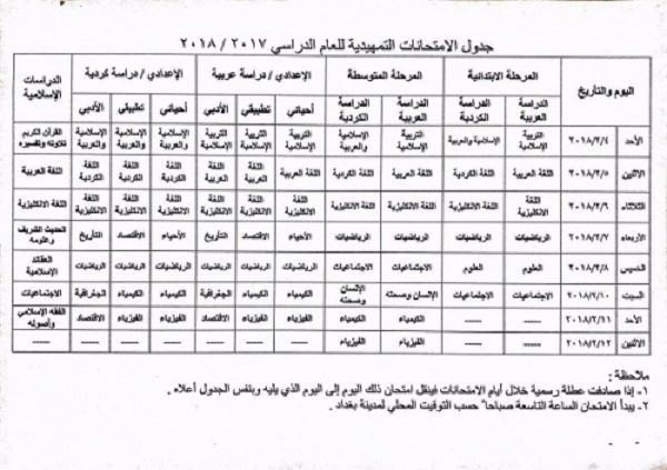 وأشار بيان صادر عن المكتب الاعلامي لوزير التربية محمد إقبال عمر الصيدلي تلقت (الحكمة) نسخة منه اليوم، أن ” الامتحانات تستمر لغاية يوم الاثنين الموافق ١٢-٢-٢٠١٨ “.