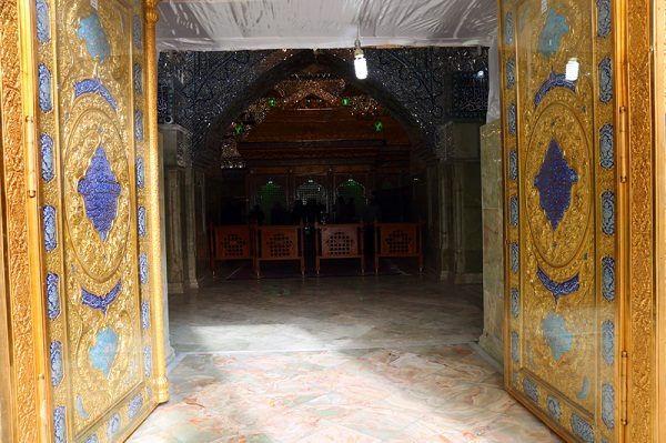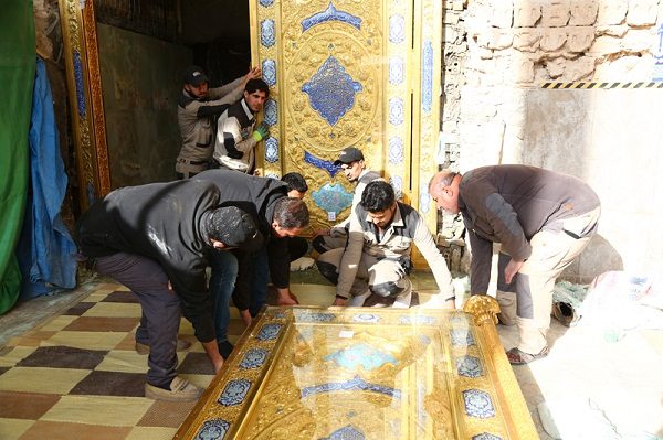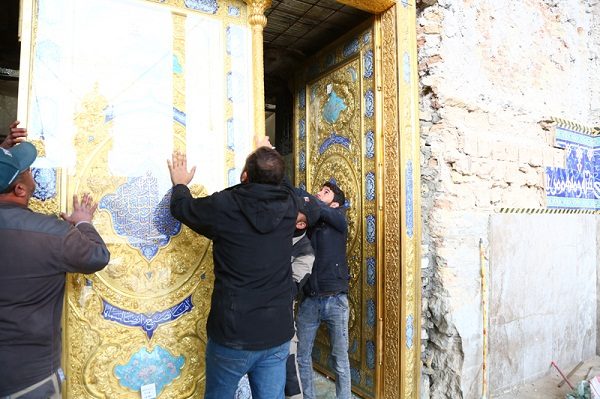 بالصور .. العتبة العسكرية المقدسة تنصب الباب الذهبي لمدخل باب القبلة للمرقد الطاهر في سامراء