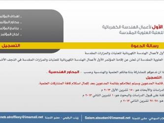 ضمن الاستعدادات الجارية لعقد المؤتمر الهندسي الاول للأعمال الكهربائية الذي يقام برعاية العتبة العلوية المقدسة للفترة من 21-23 محرم 1435هـ الموافق 25-27 تشرين الثاني 2013 في قاعة غرفة تجارة النجف ، تواصل هيئة المستشارين في الامانة العامة للعتبة العلوية المقدسة استلام مختلف البحوث المتخصصة التي من المؤمل مشاركتها في أعمال المؤتمر العلمي المتخصص.