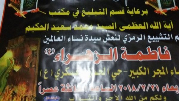 المجر الكبير (محافظة ميسان) – الحكمة: برعاية قسم التبليغ في مكتب سماحة المرجع الديني الكبير آية الله العظمى السيد محمد سعيد الحكيم (مدّ ظله)، أقيم في مدينة المجر الكبير في محافظة ميسان التشييع الرمزي لنعش مولاتنا الزهراء عليها السلام.