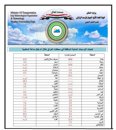 صوت البيئة بالأرقام.. كمية الأمطار الساقطة خلال الـ 24 ساعة الماضية اخر تحديث أبريل 13, 2018 339 شارك الحكمة : شهدت محافظات ومدن العراق، يوم أمس هطول أمطار غزيرة ومتوسطة تسببت بغرق مناطق وشوارع كالعادة. 339 شارك FacebookTwitterGoogle+WhatsAppالبريد الإلكترونيTelegram
