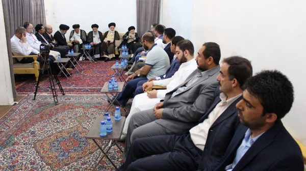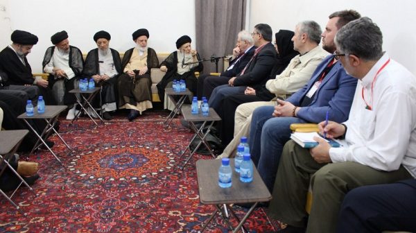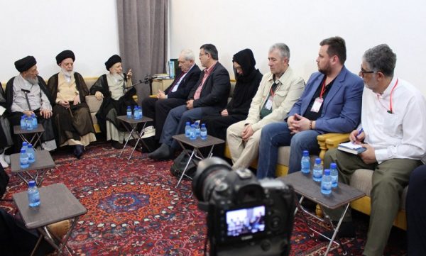 المرجع الكبير السيد محمد سعيد الحكيم (مدّ ظله) يستقبل الوفود الأجنبية المشاركة بمهرجان ربيع الشهادة؛ ويبين للضيوف الإسلام الحقيقي والصحيح، الذي حرِفَ وشوِهَ بسبب الصراعات السياسية والمصالح الشخصية