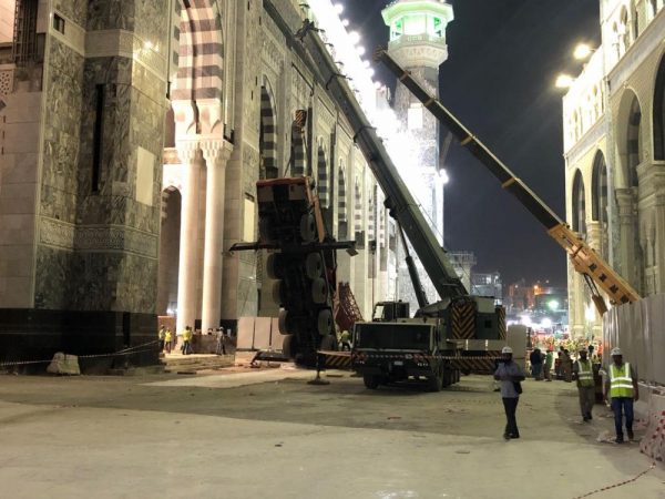 وقالت إمارة مكة في بيان مقتضب نشرته عبر “تويتر”: “سقوط ذراع رافعة متحركة داخل منطقة عمل في المسجد الحرام، وجاري اتخاذ الإجراءات اللازمة”.