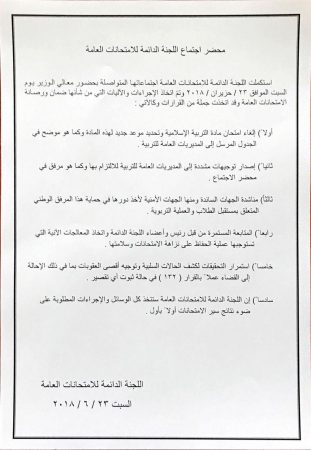 أهمها تأجيل الامتحانات.. تعرف على القرارات والتعليمات الصادرة عن وزارة التربية حول قضية أسئلة مادة التربية الإسلامية