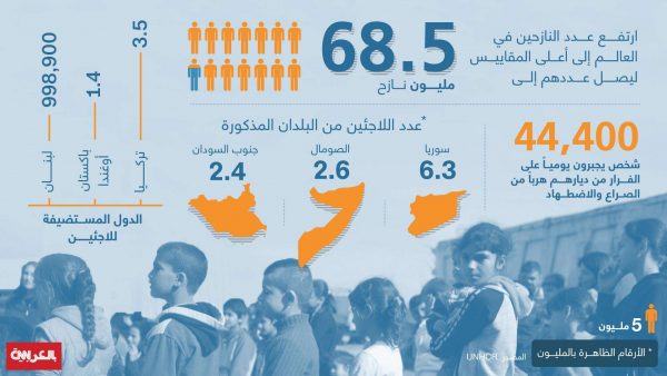الحكمة – متابعة: نشرت المفوضية السامية للأمم المتحدة لشؤون اللاجئين إحصائيات حول ارتفاع أعداد اللاجئين حول العالم، مؤكدة أنها أرقام لم تشهد لها البشرية مثيلا. فوفقا لتقرير المفوضية، شُرِّد أكثر من 68.5 مليون شخص من منازلهم، من بينهم 24.5 مليون لاجئ، أكثر من نصفهم من الأطفال.