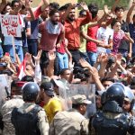 Iraqi riot police lined up as protesters chant slogans and hold up signs during a demonstration in Basra on July 15, 2018. The arabic sign in red at top left reads:"Basra oil for Basra". Dozens of demonstrators were wounded in southern Iraq today in clashes with police as protests over unemployment and a lack of basic services entered a second week, officials said. / AFP PHOTO / Haidar MOHAMMED ALI