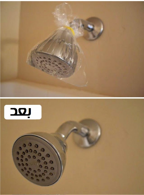 4- لتنظيف صنابير المياة ودش الاستحمام قومي بوضع الخل عليها لفترة 20 دقيقة على سبيل المثال ثم قومي بتنظيفها لإزالة الأوساخ الملتصقة بها. وإن لم يفلح الأمر قومي بربط كيس بلاستيكي به كمية من الخل حول رأس الدش أو الصنبور واتركيه لفترة تصل إلى ساعة كاملة ثم نظفيه بالكامل.