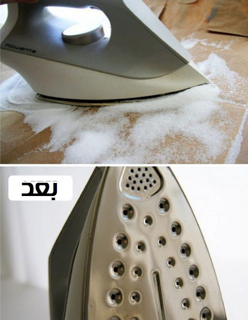 5- لتنظيف السطح المعدني للمكواة ضعي ورق على سطح مستوي يحتمل الحرارة ثم ضعي فوقه بعضاً من الملح ثم قومي بتشغيل المكواة على أقصى درجة حرارة وتأكدي من عدم وجود مياة بداخلها وأن خاصية البخار مقفلة، ثم قومي بتكمشية المكواة الساخنة على الملح وسوف تلاحظي أن الأوساخ سوف تُزال من على سطح المكواة.