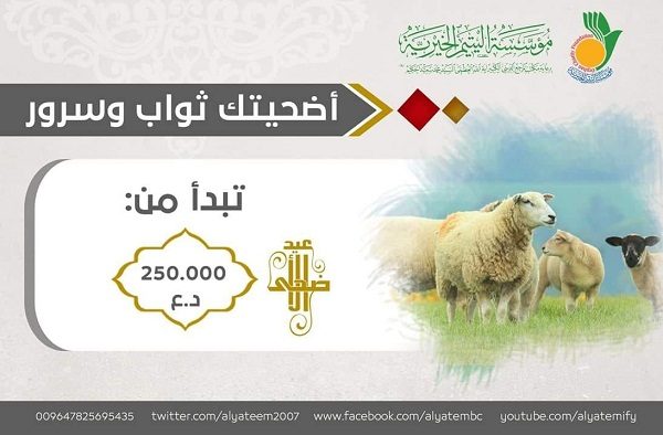 مؤسسة اليتيم الخيرية تعلن عن استعدادها لاستلام الأضاحي لتوزيعها لعوائل الأيتام تحت شعار (اضحيتك .. ثواب .. وسرور)