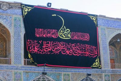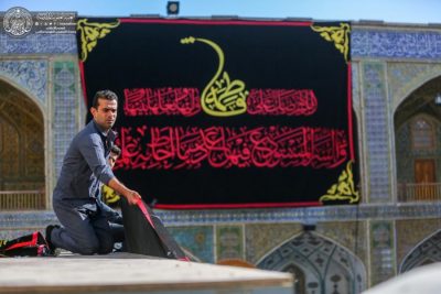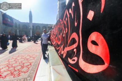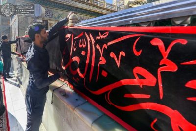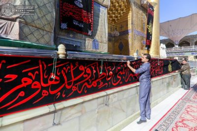 بالصور .. نشر معالم الحزن والسواد في أرجاء مرقد أمير المؤمنين (ع) إيذاناً بحلول ذكرى شهادة السيدة الزهراء فاطمة (ع)