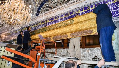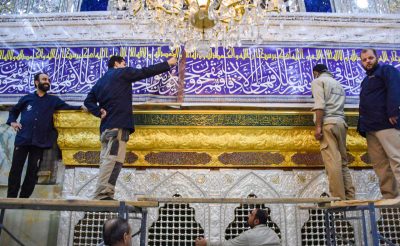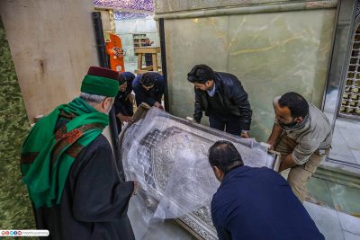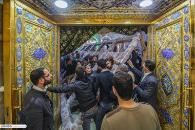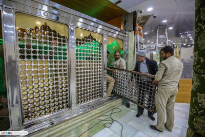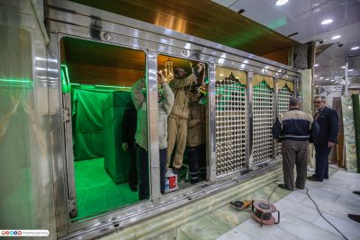 أنجزت الملاكات الهندسية والفنية في العتبة الحسينية المقدسة أعمال تنصيب أجزاء الشباك الجديد لضريح شهداء الطف في كربلاء.