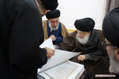 خلال استقباله وفد دار الكتابة بطهران.. المرجع السيد الحكيم يوصي بأن تبقى العلاقة بين الإنسان والقرآن محفوظة بالالتزام والإقرّار بالثَّقَلَين
