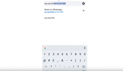 -التوجه إلى أي متصفح موجود في الهاتف أو جهاز كمبيوتر، وفي الحقل المخصص لكتابة عناوين المواقع يجب على المستخدم أن يكتب عبارة (wa.me)، ومن ثم يرفقها بالرمز (/)، وبعده رقم هاتف الشخص الذي يريد أن يرسل إليه الرسالة مضافا إليه الرمز الدولي للبلد الذي يقيم فيه، لكن دون إضافة أي أصفار أو رمز (+)، ومن ثم الضغط على زر (Enter).